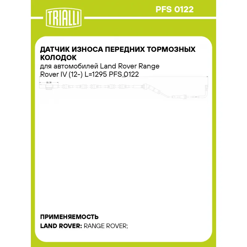 Датчик износа передних тормозных колодок для автомобилей Land Rover Range Rover IV (12-) L=1295 Характеристики: Артикул: PFS 0122 OEM номера: LR084048, LR122455 Длина, мм: 1295 Сторона установки: Передняя ось Необходимое количество: 1 на ось Количество на автомобиль: 1 Гарантийный срок: 1 год / 30.000 км Товарная линейка: BLACK Комплектация: Датчик износа - 1 шт Гарантия: от 1 года.