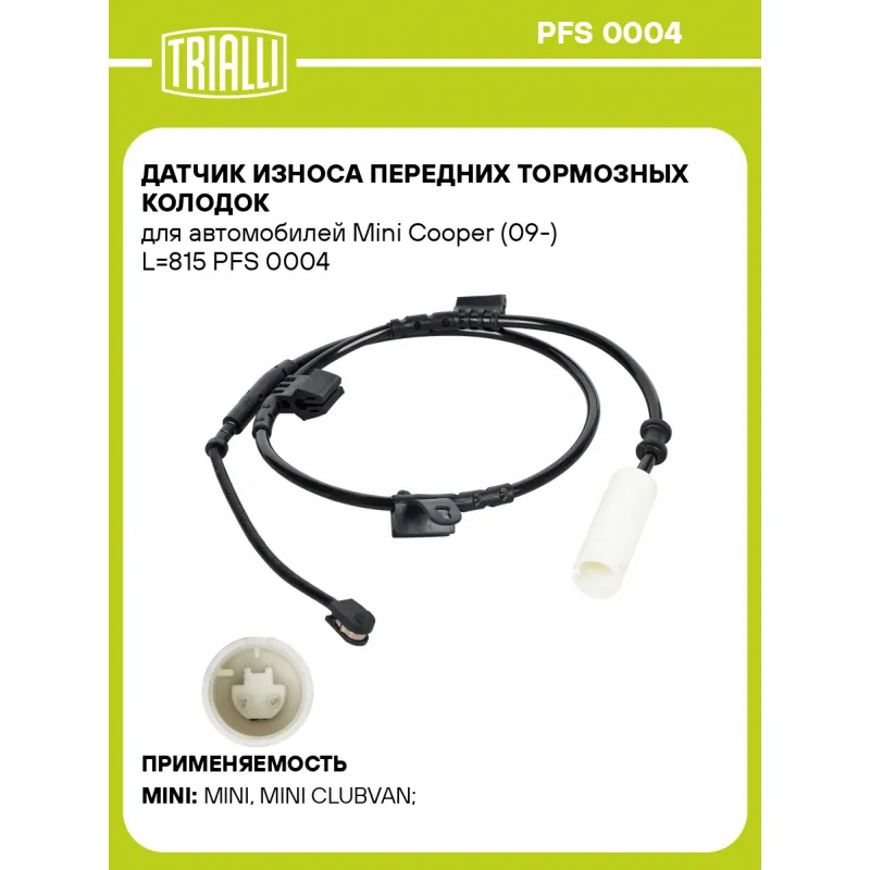 Датчик износа передних тормозных колодок для автомобилей Mini Cooper (09-) L=815 Характеристики: Артикул: PFS 0004 OEM номера: 34356792572 Длина, мм: 815 Сторона установки: Передняя ось Необходимое количество: 1 на ось Количество на автомобиль: 1 Гарантийный срок: 1 год / 30.000 км Товарная линейка: BLACK Комплектация: Датчик износа - 1 шт Гарантия: от 1 года.