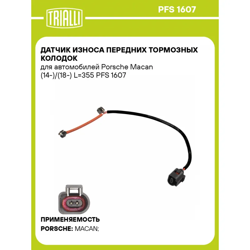 Датчик износа передних тормозных колодок для автомобилей Porsche Macan (14-)/(18-) L=355 Характеристики: Артикул: PFS 1607 OEM номера: 95B907253, 95B907253F, 95B907253G Длина, мм: 355 Необходимое количество: 2 на ось Количество на автомобиль: 2 Сторона установки: Передняя ось Гарантийный срок: 1 год / 30 000 км Товарная линейка:... Читать полностью →