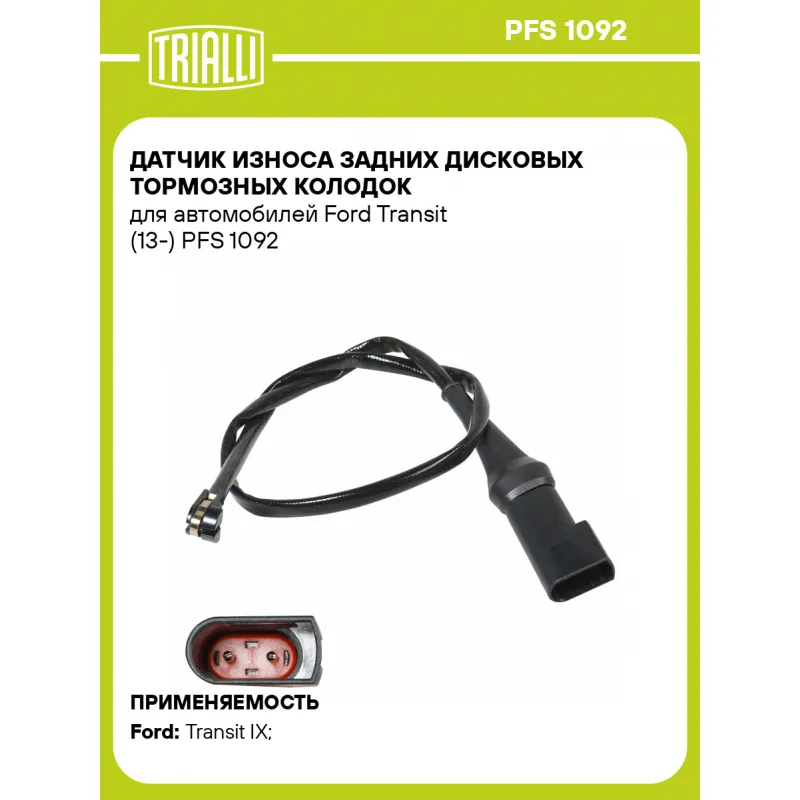 Датчик износа задних дисковых тормозных колодок для автомобилей Ford Transit (13-) Характеристики: Артикул: PFS 1092 OEM номера: 1792658, 1763904, 1787173, 1842816, 2006779, BK212N248BC Необходимое количество: 2 на ось Количество на автомобиль: 2 Сопутствующие товары:: PF 1092 Длина, мм: 475 Сторона установки: Задняя ось Гарантийный срок: 1 год / 30 000 км Товарная линейка: BLACK Подходит для авто: Ford Transit IX (13-) Для проверки применяемости отправьте VIN автомобиля через вкладку "Есть вопросы о товаре?" Комплектация: Датчик износа электронный - 1 шт Гарантия: от 1 года.