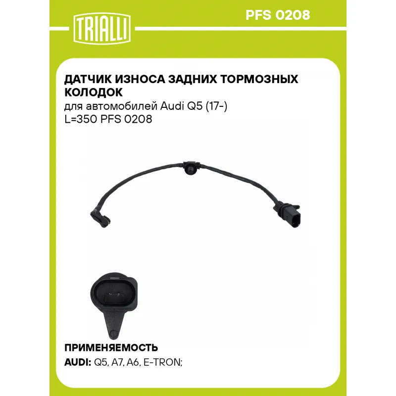 Датчик износа задних тормозных колодок для автомобилей Audi Q5 (17-) L=350 Характеристики: Артикул: PFS 0208 OEM номера: 80A615121 Длина, мм: 350 Сторона установки: Задняя ось Необходимое количество: 1 на ось Количество на автомобиль: 1 Гарантийный срок: 1 год / 30.000 км Товарная линейка: BLACK Комплектация: Датчик износа - 1 шт Гарантия: от 1 года.