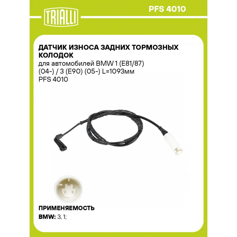 Датчик износа задних тормозных колодок для автомобилей BMW 1 (E81/87) (04-) / 3 (E90) (05-) L=1093мм Характеристики: Артикул: PFS 4010 OEM номера: 34356789445, 34356762253 Необходимое количество: 1 на ось Количество на автомобиль: 1 Сопутствующие товары:: PF 4010 Длина, мм: 1093 Сторона установки: Задняя ось Гарантийный срок: 1 ... Читать полностью →