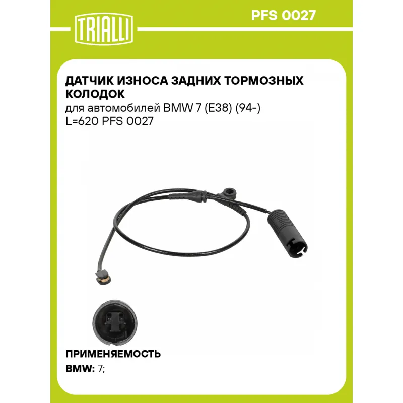 Датчик износа задних тормозных колодок для автомобилей BMW 7 (E38) (94-) L=620 Характеристики: Артикул: PFS 0027 OEM номера: 34351182065 Длина, мм: 620 Сторона установки: Задняя ось Необходимое количество: 1 на ось Количество на автомобиль: 1 Гарантийный срок: 1 год / 30.000 км Товарная линейка: BLACK Комплектация: Датчик износа - 1 шт Гарантия: от 1 года.
