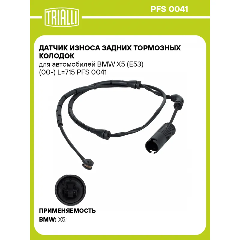 Датчик износа задних тормозных колодок для автомобилей BMW X5 (E53) (00-) L=715 Характеристики: Артикул: PFS 0041 OEM номера: 34351165580 Длина, мм: 715 Сторона установки: Задняя ось Необходимое количество: 1 на ось Количество на автомобиль: 1 Гарантийный срок: 1 год / 30.000 км Товарная линейка: BLACK Комплектация: Датчик износа - 1 шт Гарантия: от 1 года.
