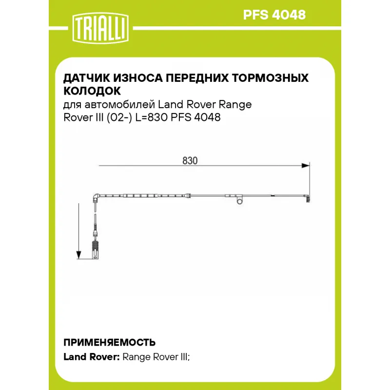 Датчик износа передних тормозных колодок для автомобилей Land Rover Range Rover III (02-) L=830 Характеристики: Артикул: PFS 4048 OEM номера: LR012824, SEM500050 Количество на автомобиль: 1 Сопутствующие товары:: PF 4048 Длина, мм: 841.5 Сторона установки: Передняя ось Гарантийный срок: 1 год / 30 000 км Необходимое количество: 1 на ось Товарная линейка: BLACK Подходит для авто: Land Rover Range Rover III (02-) Для проверки применяемости отправьте VIN автомобиля через вкладку "Есть вопросы о товаре?" Комплектация: Датчик износа - 1 шт Гарантия: от 1 года.
