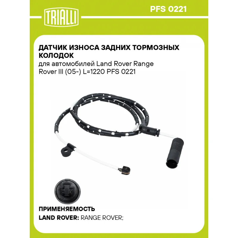 Датчик износа задних тормозных колодок для автомобилей Land Rover Range Rover III (05-) L=1220 Характеристики: Артикул: PFS 0221 OEM номера: SOE000010, SOE000011 Длина, мм: 1220 Сторона установки: Задняя ось Необходимое количество: 1 на ось Количество на автомобиль: 1 Гарантийный срок: 1 год / 30.000 км Товарная линейка: BLACK Комплектация: Датчик износа - 1 шт Гарантия: от 1 года.