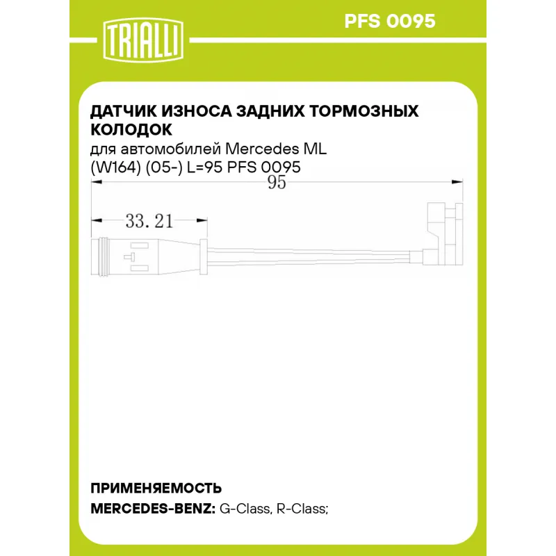 Датчик износа задних тормозных колодок для автомобилей Mercedes ML (W164) (05-) L=95 Характеристики: Артикул: PFS 0095 OEM номера: 1645401017, 2205401517, A1645401017, A2205401517 Длина, мм: 95 Сторона установки: Задняя ось Необходимое количество: 1 на ось Количество на автомобиль: 1 Гарантийный срок: 1 год / 30.000 км Товарная линейка: BLACK Комплектация: Датчик износа - 1 шт Гарантия: от 1 года.