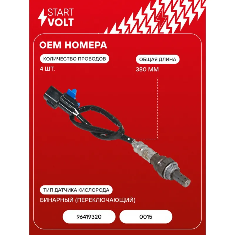 Датчик кислорода для автомобилей Chevrolet Spark (05-) 1.0i после катализатора Характеристики: Артикул: VS-OS 0534 OEM номера: 96419320, 0015 Количество на автомобиль: 1 Тип датчика кислорода: Бинарный (переключающий) Общая длина, мм: 380 Количество проводов: 4 Подходит для авто: Chevrolet Spark (05-) Daewoo Matiz (05-) Для проверки применяемости отправьте VIN автомобиля через вкладку "Есть вопросы о товаре?" Комплектация: Датчик кислорода - 1 шт Паспорт изделия/гарантийный талон - 1 шт Гарантия: от 1 года.