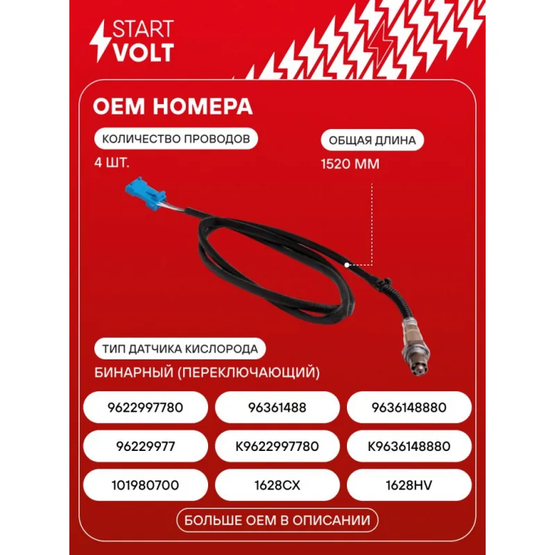 Датчик кислорода для автомобилей Citroen C4 (04-) 1.6i/2.0i/Peugeot 307 (00-) 1.6i после катализатора Характеристики: Артикул: VS-OS 2012 OEM номера: 101980700, 1628CX, 1628HV, 96229977, K9622997780, K9636148880, 9622997780, 96361488, 9636148880, 0 258 006 029 Количество на автомобиль: 1 Тип датчика кислорода: Бинарный (переключающий) Общая длина, мм: 1520 Количество проводов: 4 Подходит для авто: Citroen C4 (04-), Xsara II (00-), C4 Aircross (12-) Peugeot 607 (02-), 206 (98-), 307 (00-), 308 (13-), 406 (96-) Для проверки применяемости отправьте VIN автомобиля через вкладку "Есть вопросы о товаре?" Комплектация: Датчик кислорода - 1 шт Паспорт изделия/гарантийный талон - 1 шт Гарантия: от 1 года.