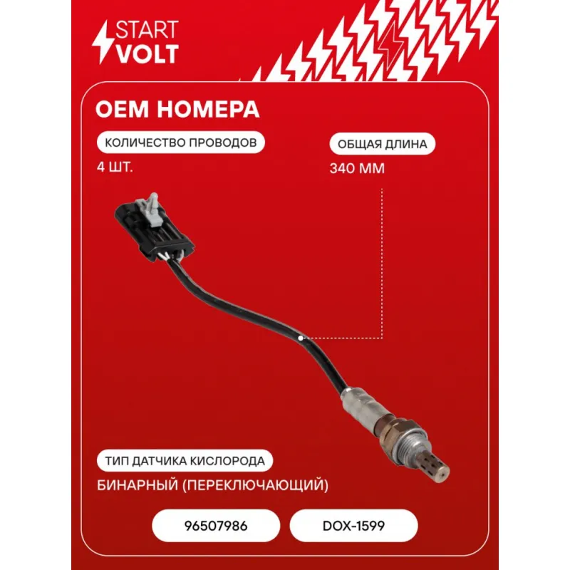 Датчик кислорода для автомобилей Daewoo Matiz (98-) 0.8i до катализатора/Chevrolet Lanos (97-) 1.5i после катализатора Характеристики: Артикул: VS-OS 0552 OEM номера: 96507986, DOX-1599 Количество на автомобиль: 1 Тип датчика кислорода: Бинарный (переключающий) Общая длина, мм: 340 Количество проводов: 4 Подходит для авто: Daewoo Matiz (98-) Chevrolet Spark (05-), Lanos (97-) Для проверки применяемости отправьте VIN автомобиля через вкладку "Есть вопросы о товаре?" Комплектация: Паспорт изделия/гарантийный талон - 1 шт Датчик кислорода - 1 шт Гарантия: от 1 года.