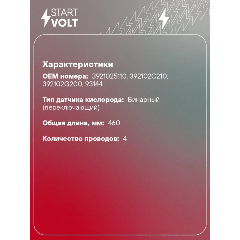 Датчик кислорода для автомобилей KIA Sorento (09-)/Hyundai Santa Fe (10-) 2.4i после катализатора Характеристики: Артикул: VS-OS 0819 OEM номера: 3921025110, 392102C210, 392102G200, 93144 Общая длина, мм: 460 Количество проводов: 4 Тип датчика кислорода: Бинарный (переключающий) Количество на автомобиль: 1 Комплектация: Датчик кислорода - 1 шт Паспорт изделия/гарантийный талон - 1 шт Гарантия: от 1 года.