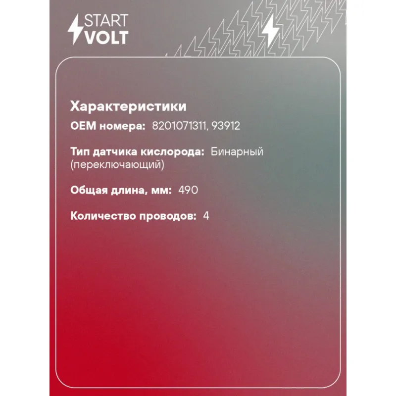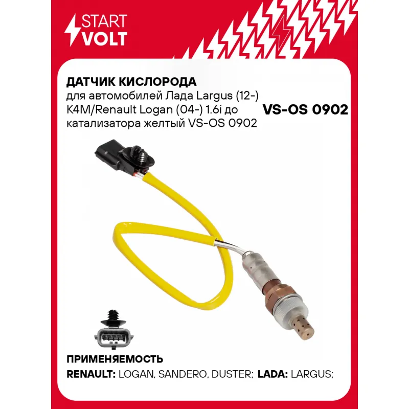 Датчик кислорода для автомобилей Лада Largus (12-) K4M/Renault Logan (04-) 1.6i до катализатора желтый Описание: Датчик кислорода VS-OS 0902 бренда STARTVOLT входит в состав системы управления двигателем внутреннего сгорания, представляет собой электронный датчик, который генерирует выходное напряжение постоянного тока в зависимости от изменения количества свободного кислорода, содержащегося в отработавших газах автомобильного двигателя. Тип датчика кислорода - Бинарный (переключающий); Применяемость кислородного датчика: LADA LARGUS, RENAULT LOGAN, SANDERO / STEPWAY, DUSTER.. Подбор по VIN-номеру вашего автомобиля - через кнопку 'Задать вопрос'. Специалист проверит применяемость и ответит вам. Действие: - показывает уровень кислорода, топлива и продуктов сгорания их смеси; - измерение уровня кислорода в выхлопных газах; - помогает оптимизировать смесь так, чтобы увеличить эффективность сгорания топлива; - повышение эффективности работы двигателя; Пользуясь качественным датчиком кислорода от бренда STARTVOLT можно избежать дорогостоящих ремонтов и продлить срок службы двигателя. Характеристики: Артикул: VS-OS 0902 OEM номера: 8201071311, 93912 Количество на автомобиль: 1 Подходящий разъем AIRLINE:: AECC025, AECC257, AECC283 Тип датчика кислорода: Бинарный (переключающий) Общая длина, мм: 490 Количество проводов: 4 Сопротивление нагревателя, Ом: 3,4 Комплектация: Паспорт изделия/гарантийный талон - 1 шт Датчик кислорода - 1 шт Гарантия: от 1 года.