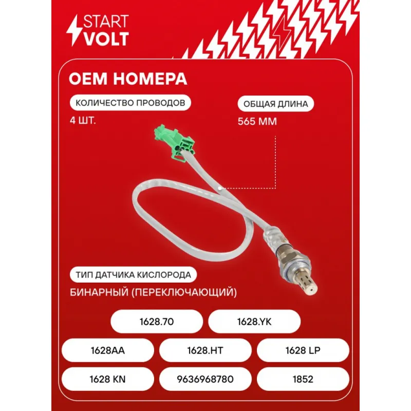 Датчик кислорода для автомобилей Peugeot 206 (98-)/Partner (96-) 1.4i до катализатора 565 мм Характеристики: Артикул: VS-OS 2004 OEM номера: 1628 KN , 9636968780, 1852, 1628AA, 1628.HT, 1628 LP, 1628.70, 1628.YK Количество на автомобиль: 1 Тип датчика кислорода: Бинарный (переключающий) Общая длина, мм: 565 Количество проводов: 4 Подходит для авто: Citroen Berlingo I (96-), C2 (03-), C3 (02-), C5 (01-) Peugeot 1007 (05-), 106 (96-), 206 (98-), 306 (97-), 307 (00-), 406 (96-), Partner (96-) Для проверки применяемости отправьте VIN автомобиля через вкладку "Есть вопросы о товаре?" Комплектация: Датчик кислорода - 1 шт Паспорт изделия/гарантийный талон - 1 шт Гарантия: от 1 года.