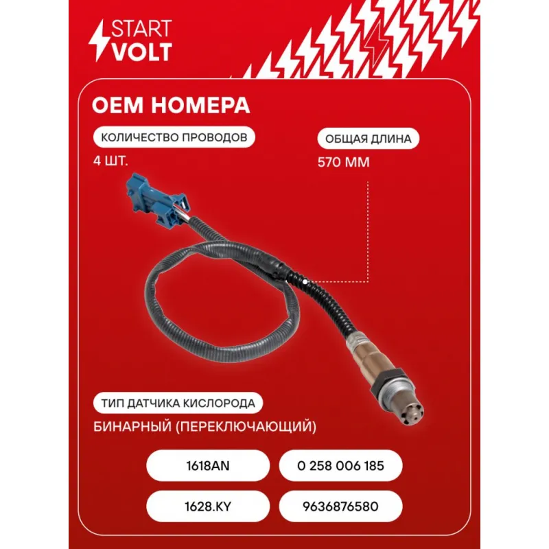 Датчик кислорода для автомобилей Peugeot 307 (02-)/Citroen C4 (04-)/Berlingo 1.6i после катализатора Характеристики: Артикул: VS-OS 2016 OEM номера: 1628.KY, 9636 876 580, 1618AN, 0 258 006 185 Количество на автомобиль: 1 Тип датчика кислорода: Бинарный (переключающий) Общая длина, мм: 570 Количество проводов: 4 Подходит для авто: Peugeot 206 (00-), 307 (00-), Partner (96-), Partner (08-) Citroen Berlingo (00-), Berlingo II (08-), C3 (02-), C4 (04-) Для проверки применяемости отправьте VIN автомобиля через вкладку "Есть вопросы о товаре?" Комплектация: Паспорт изделия/гарантийный талон - 1 шт Датчик кислорода - 1 шт Гарантия: от 1 года.