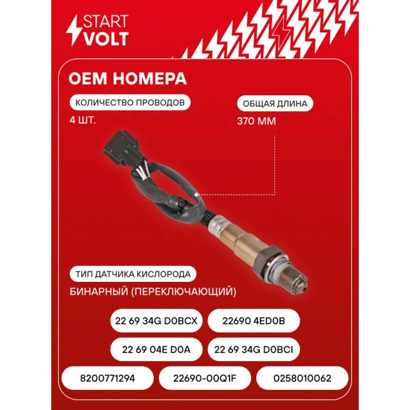 Датчик кислорода для автомобилей Renault Duster (10-)/Kaptur (16-)/Fluence (11-) 2.0i до катализатора Характеристики: Артикул: VS-OS 0905 OEM номера: 8200771294, 22690-00Q1F, 0258010062, 22 69 04E D0A, 22 69 34G D0BCI, 22 69 34G D0BCX, 22690 4ED0B Количество на автомобиль: 1 Подходящий разъем AIRLINE:: AECC283, AECC257, AECC025 Тип датчика кислорода: Бинарный (переключающий) Общая длина, мм: 370 Количество проводов: 4 Подходит для авто: Renault Fluence (10-), Kaptur (16-), Duster (10-) Nissan Terrano (14-) Для проверки применяемости отправьте VIN автомобиля через вкладку "Есть вопросы о товаре?" Комплектация: Паспорт изделия/гарантийный талон - 1 шт Датчик кислорода - 1 шт Гарантия: от 1 года.