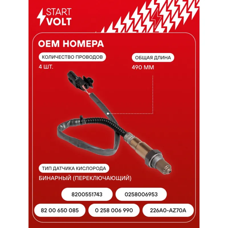 Датчик кислорода для автомобилей Renault Logan (07-)/Logan (12-) 1.6i/Duster 2.0i (4х2) Характеристики: Артикул: VS-OS 0904 OEM номера: 82 00 650 085, 0 258 006 990, 226A0-AZ70A, 8200551743, 0258006953 Количество на автомобиль: 1 Подходящий разъем AIRLINE:: AECC025, AECC283, AECC257 Тип датчика кислорода: Бинарный (переключающий) Общая длина, мм: 490 Количество проводов: 4 Подходит для авто: Renault Fluence (10-), Sandero I (09-), Logan (08-), Logan II (12-), Duster (10-), Megane III (08-), Megane II (02-) Для проверки применяемости отправьте VIN автомобиля через вкладку "Есть вопросы о товаре?" Комплектация: Датчик кислорода - 1 шт Паспорт изделия/гарантийный талон - 1 шт Гарантия: от 1 года.