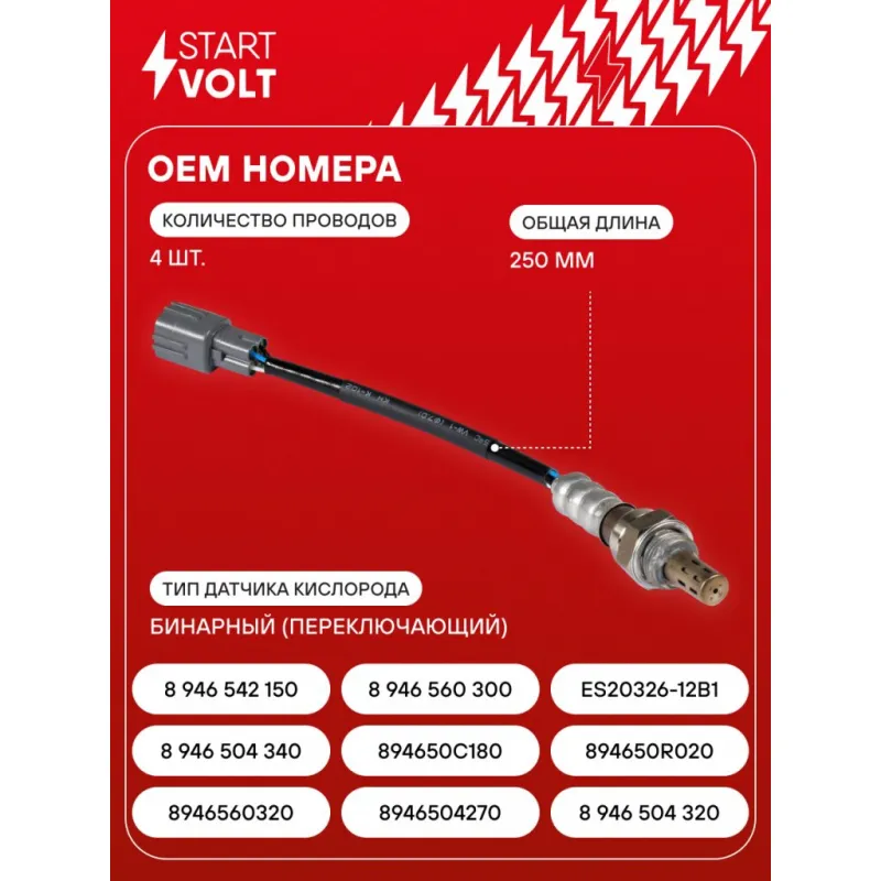 Датчик кислорода для автомобилей Toyota Camry V50 (11-) 3.5i/LC Prado (02-) 4.0i после катализатора Характеристики: Артикул: VS-OS 1930 OEM номера: 89465 60320, 89465 04270, 89465 04320, 89465 04340, 894650C180, 894650R020, 89465 42150, 89465 60300, ES20326-12B1 Количество на автомобиль: 1 Тип датчика кислорода: Бинарный (переключающий) Общая длина, мм: 250 Количество проводов: 4 Подходит для авто: Lexus GX J120 (02-) Toyota Alphard II (08-), Camry (96-), Camry (01-), Camry (11-), FJ Cruiser (07-), Land Cruiser Prado 120 (02-), Land Cruiser Prado 150 (09-) Для проверки применяемости отправьте VIN автомобиля через вкладку "Есть вопросы о товаре?" Комплектация: Датчик кислорода - 1 шт Паспорт изделия/гарантийный талон - 1 шт Гарантия: от 1 года.