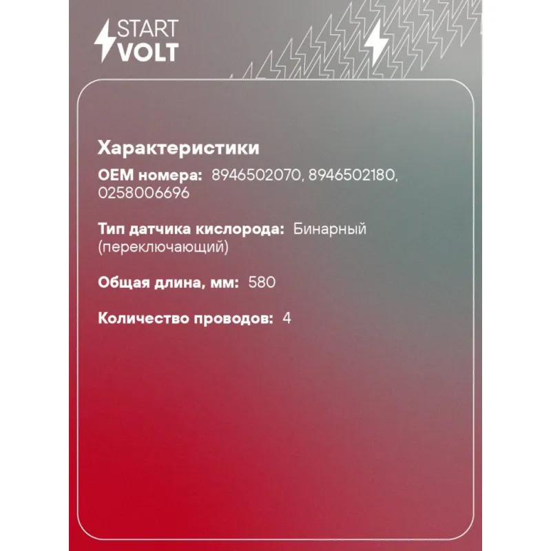Датчик кислорода для автомобилей Toyota Corolla (00-)/Auris (06-) 1.4i после катализатора Характеристики: Артикул: VS-OS 2732 OEM номера: 8946502070, 8946502180, 0258006696 Общая длина, мм: 580 Количество проводов: 4 Тип датчика кислорода: Бинарный (переключающий) Количество на автомобиль: 1 Комплектация: Датчик кислорода - 1 шт Паспорт изделия/гарантийный талон - 1 шт Гарантия: от 1 года.