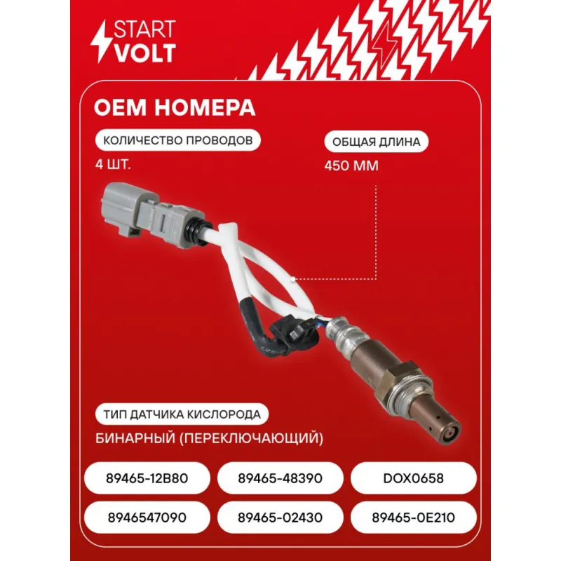 Датчик кислорода для автомобилей Toyota Corolla (19-) 1.6i после катализатора Характеристики: Артикул: VS-OS 2139 OEM номера: 8946547090, 89465-02430, 89465-0E210, 89465-12B80, 89465-48390, DOX0658 Общая длина, мм: 450 Количество проводов: 4 Тип датчика кислорода: Бинарный (переключающий) Количество на автомобиль: 1 Комплектация: Паспорт изделия/гарантийный талон - 1 шт Датчик кислорода - 1 шт Гарантия: от 1 года.