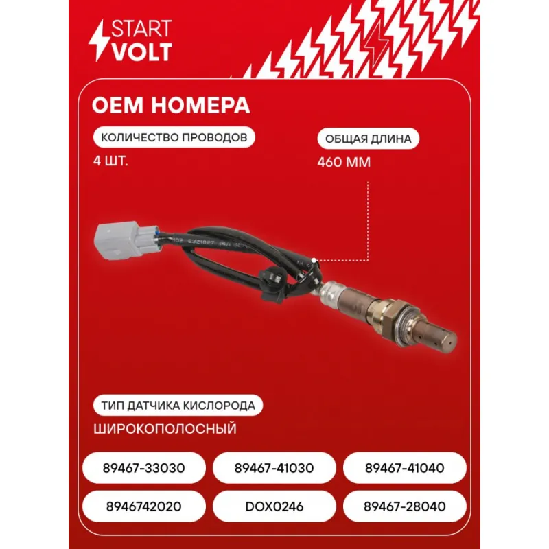 Датчик кислорода для автомобилей Toyota RAV4 (00-) 2.0i до катализатора Характеристики: Артикул: VS-OS 2128 OEM номера: 8946742020, DOX0246, 89467-28040, 89467-33030, 89467-41030, 89467-41040 Общая длина, мм: 460 Количество проводов: 4 Тип датчика кислорода: Широкополосный Количество на автомобиль: 1 Подходит для авто: Toyota... Читать полностью →