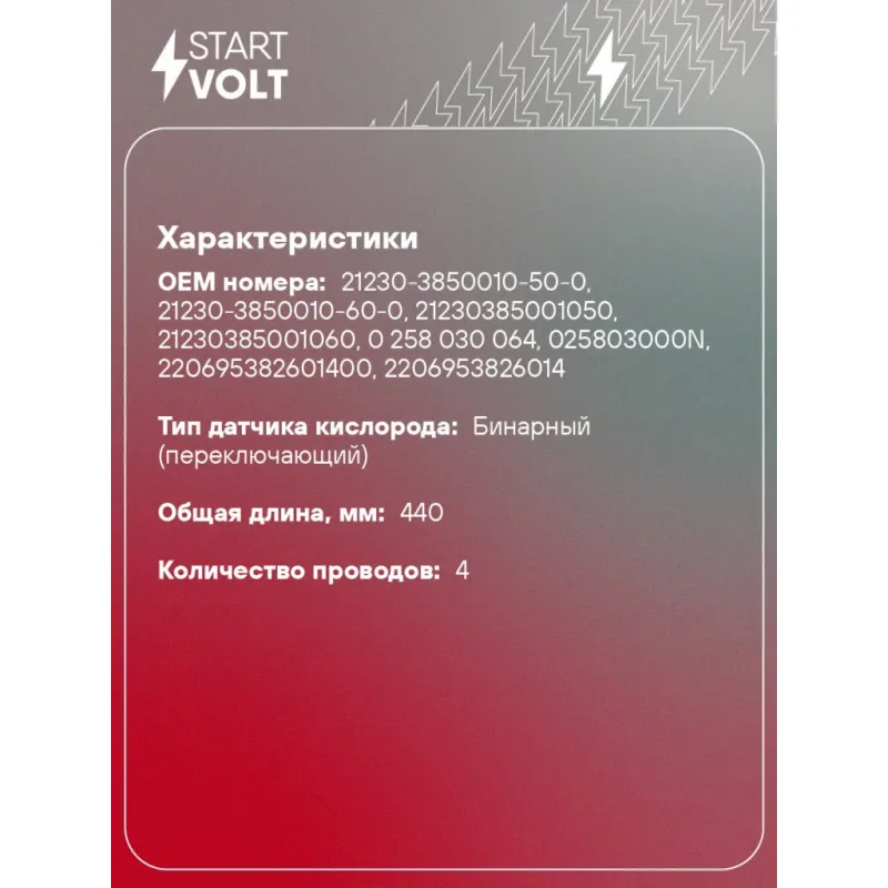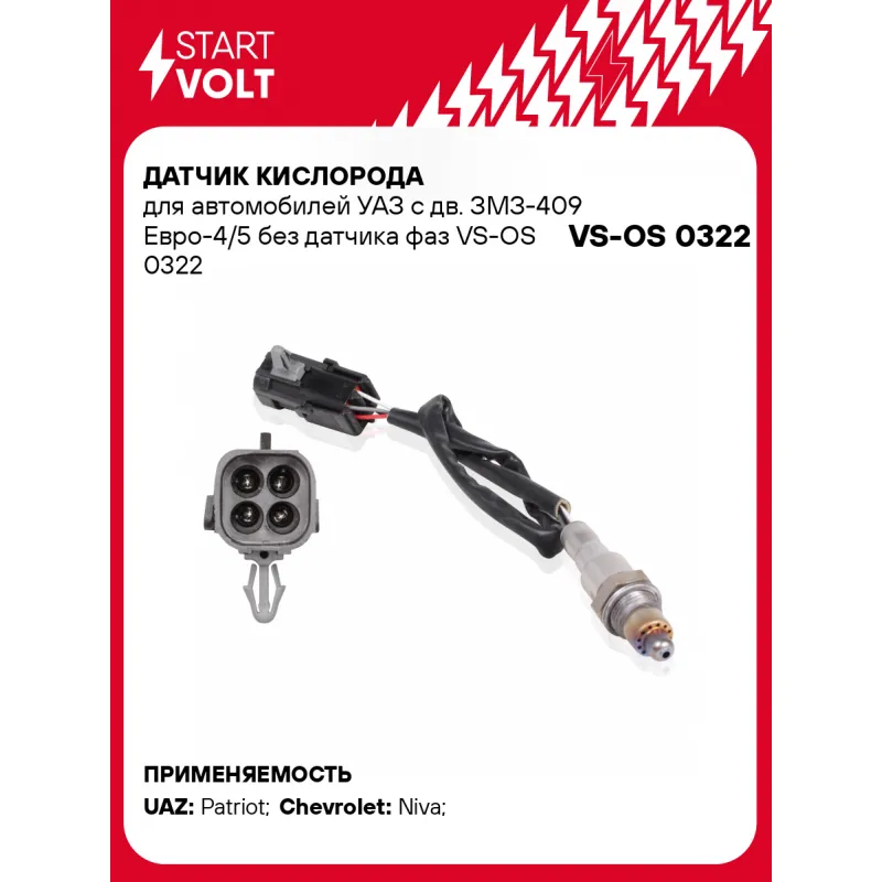 Датчик кислорода для автомобилей УАЗ с дв. ЗМЗ-409 Евро-4/5 без датчика фаз Описание: Датчик кислорода VS-OS 0322 бренда STARTVOLT входит в состав системы управления двигателем внутреннего сгорания, представляет собой электронный датчик, который генерирует выходное напряжение постоянного тока в зависимости от изменения количества свободного кислорода, содержащегося в отработавших газах автомобильного двигателя. Тип датчика кислорода - Бинарный (переключающий); Применяемость кислородного датчика: CHEVROLET NIVA, LADA NIVA, UAZ PATRIOT, PICKUP, 452, HUNTER, CARGO.. Подбор по VIN-номеру вашего автомобиля - через кнопку 'Задать вопрос'. Специалист проверит применяемость и ответит вам. Действие: - показывает уровень кислорода, топлива и продуктов сгорания их смеси; - измерение уровня кислорода в выхлопных газах; - помогает оптимизировать смесь так, чтобы увеличить эффективность сгорания топлива; - повышение эффективности работы двигателя; Пользуясь качественным датчиком кислорода от бренда STARTVOLT можно избежать дорогостоящих ремонтов и продлить срок службы двигателя. Характеристики: Артикул: VS-OS 0322 OEM номера: 21230-3850010-50-0, 21230-3850010-60-0, 21230385001050, 21230385001060, 0 258 030 064, 025803000N, 220695382601400, 2206953826014 Количество на автомобиль: 1 Подходящий разъем AIRLINE:: AECC278, AECC005 Тип датчика кислорода: Бинарный (переключающий) Общая длина, мм: 440 Количество проводов: 4 Сопротивление нагревателя, Ом: 3 Подходит для авто: УАЗ Patriot (08-) Chevrolet Niva (02-) Для проверки применяемости отправьте VIN автомобиля через вкладку "Есть вопросы о товаре?" Комплектация: Датчик кислорода - 1 шт Паспорт изделия/гарантийный талон - 1 шт Гарантия: от 1 года.