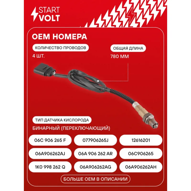 Датчик кислорода для автомобилей VAG Octavia (96-)/Golf IV (97-) 1.4i-2.0i 750 мм после катализатора Характеристики: Артикул: VS-OS 1940 OEM номера: 1K0 998 262 Q, 06A906262AG, 06A906262AH, 06A906262AJ, 06A 906 262 AR, 06C906265, 06C 906 265 F, 077906265J, 12616201, 030906262L, 030 906 262 M, 030 906 262 D, 030 906 262 E, 058906265C, 058906265V, 06A 906 262 AM, 06A 906 262 DL, 06A 906 262 EA, 06A 906 262 EC, 06A906262F, 06A906262G, 06A906262N, 06C 906 265 D, 06C 906 265 G, 0258010032 Общая длина, мм: 780 Количество проводов: 4 Тип датчика кислорода: Бинарный (переключающий) Количество на автомобиль: 1 Подходит для авто: Skoda Superb I (01-), Octavia (96-), Fabia I (99-) Volkswagen Passat B5 (96-), Golf IV (97-), Bora (99-) Audi A6 C5 (97-), A4 B5 (94-), A4 B7 (04-) Для проверки применяемости отправьте VIN автомобиля через вкладку "Есть вопросы о товаре?" Комплектация: Втлка пластиковая из 2 частей - 1 шт Паспорт изделия/гарантийный талон - 1 шт Клипса установочная - 1 шт Датчик кислорода - 1 шт Корпус разъема (с уплотнителем) - 1 шт Хомут пластиковый - 2 шт Гарантия: от 1 года.
