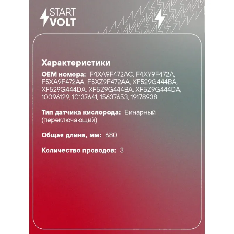 Датчик кислорода универсальный аналог 0258005726 Характеристики: Артикул: VS-OS 0003 OEM номера: F4XA9F472AC, F4XY9F472A, F5XA9F472AA, F5XZ9F472AA, XF529G444BA, XF529G444DA, XF5Z9G444BA, XF5Z9G444DA, 8970622920, B6DC18861, B6DC18861A, B6DC18861A9U, F8K118861, FE3N18861, FSD918861, TA3618861B, TA3618861B9U, TA3718861B, TA3718861C, TA3718861E, TA3718861E9U, FSD918861A, JE0818861B, JE1518861, JE1518861A, JE1518861A03, TA3618861A, 2269030P00, 2269040P10, 2269048P00, 8200024503, 22690AA350, 226900A510, 226900B710, 226900B711, 226900B712, 226900M210, 226900M211, 22690AA740, 22690AA270, 22690AA290, 22690AA310, 22690AA330, 22690AA341, 22690AA440, 22690AA150, 22690AA160, 22690AA161, 22690AA170, 22690AA180, 22690AA190, 22691VE401, 22691VE403, 226A07B000, 226A07B001, B269010Y10, 22690AA090, 226914W002, 226916P000, 226916P002, 226918J101, 226919M600, 226919M601, 226910W702, 226912Y900, 226912Y901, 226914L701, 226914L703, 226914W000, 22690VR601, 22690VW000, 22690VW001, 22690VX000, 226910W001, 226910W700, 22690AA001, 22690AA005, 22690AA007, 22690VE401, 22690VH301, 22690VR600, 226908P300, 226908P301, 2269091N00, 2269094Y00, 2269094Y01, 2269094Y10, 2269083T11, 2269083T12, 2269083T13, 2269085T00, 226908H600, 226908H601, 226907J100, 226907J110, 226907J111, 226907P000, 226907P002, 2269083T10, 2269072F01, 2269072F03, 2269075P01, 2269075P11, 2269075P16, 226907B000, 2269069F03, 226906M000, 226906M001, 226906P000, 226906P002, 2269070T01, 2269067U00, 2269067U01, 2269067U10, 2269067U12, 2269069F01, 2269069F02, 2269064Y11, 2269064Y12, 2269065F00, 2269065F02, 2269066N00, 2269066N01, 2269064U00, 2269064U01, 2269064U05, 2269064U06, 2269064Y05, 2269064Y10, 2269060U01, 2269060U02, 2269060U11, 2269060U12, 2269061U01, 2269061U11, 226905U001, 226905V100, 226905V101, 226905V420, 226905V421, 2269060F00, 226905J000, 226905J001, 226905L300, 226905L301, 226905L310, 226905U000, 226904W001, 226904W004, 2269050F02, 2269050F03, 226905E400, 226905E401, 226904P102, 226904P200, 226904P202, 226904S100, 226904S101, 226904W000, 2269048P11, 226904M200, 226904M201, 226904P000, 226904P001, 226904P100, 2269046P00, 2269046P01, 2269046P10, 2269046P11, 2269046R00, 2269048P01, 2269040U10, 2269040U15, 2269040U16, 2269041B00, 2269041B10, 2269041B20, 226903J100, 226903J101, 226903S501, 2269040U00, 2269040U05, 2269040U06, 2269030F00, 2269030P10, 2269036F00, 226903C200, 226903C201, 226903C203, 2269024U03, 226902H800, 226902H801, 226902P100, 226902Y920, 226902Y921, 226901P600, 226901P601, 2269021U01, 2269024U00, 2269024U01, 2269024U02, 226901A100, 226901A101, 226901P105, 226901P106, 226901P115, 226901P116, 2269010Y01, 2269010Y10, 2269017Y00, 2269017Y01, 2269017Y10, 2269017Y11, 226900M220, 226900W700, 226900W702, 226900Z800, 226900Z801, 2269010Y00, 10096129, 19178938, 25108814, 25132169, 25132789, 25133505, 97018587, 97062292, 25161152, 25161530, 25165314, 25178076, 25312185, 8990793, 3921022010, 3921022015, 3921022040, 3921022115, MB6DC18861, MB6DC18861A, MBP3C18861, 0258005726, 13482, 10137641, 15637653, 25132535, 25133503, 25165312, 25176708, 25176709, 25312179 Количество на автомобиль: 1 Тип датчика кислорода: Бинарный (переключающий) Общая длина, мм: 680 Количество проводов: 3 Сопротивление нагревателя, Ом: 3,4 Комплектация: Пластиковый хомут - 2 шт Коннектор для проводов (из 3 частей) - 3 шт Втулка металлическая - 3 шт Паспорт изделия/гарантийный талон - 1 шт Крышка пластикового корпуса разъема - 1 шт Резиновая втулка - 6 шт Датчик кислорода - 1 шт Инструкция по установке - 1 шт Пластиковый корпус разъема - 1 шт Гарантия: от 1 года.