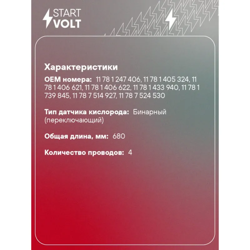 Датчик кислорода универсальный аналог 0258986505 Характеристики: Артикул: VS-OS 0017 OEM номера: 11 78 1 247 406, 11 78 1 405 324, 11 78 1 406 621, 11 78 1 406 622, 11 78 1 433 940, 11 78 1 739 845, 11 78 7 514 927, 11 78 7 524 530, 11 78 7 512 002, 11 78 7 512 567, 11 78 7 512 973, 11 78 7 513 962, 11 78 7 513 963, 11 78 7 514 926, 11 78 1 742 050, 11 78 1 742 051, 11 78 1 742 053, 11 78 1 743 994, 11 78 1 743 996, 11 78 7 506 539, 46 555 846, 46 737 471, 000 540 71 17, 000 540 72 17, 000 540 75 17, 0005407617, 00 540 81 17, 000 540 85 17, A0005408917, A0005409017, A0005409117, 0015401117, 0015401217, 0015402817, A0005407217, A0005407517, A0005408517, A0005407617, 0005409617, 0005409717, 0015400117, 0015400817, 0015401017, A 001 540 08 17, A 001 540 10 17, A 001 540 11 17, A 001 540 12 17, A 001 540 28 17, A 000 540 71 17, 000 540 89 17, 000 540 90 17, 000 540 91 17, A 000 540 96 17, A 000 540 97 17, A 001 540 01 17, 986 606 126 01, 986 606 127 01, 986 606 128 01, 993 606 116 01, 993 606 118 01, 993 606 126 01, 993 606 128 01, 996 606 118 00, 9 125 582, 9 202 719, 90540984, 90540985, 0K2A5 18861, 0K2AA 18861, 0K2AB 18861, 39210 22020, 39210 22025, 39210 22026, 39210 23060, 39210-38025, 39210 23025, 39210 23026, 39210 23030, 39210 23035, 39210 23036, 39210 23046, 39210 22030, 39210 22035, 39210 22045, 39210 22050, 39210 22051, 39210 23020, 0K011 18861, 0K08A 18861B, 0K08B 18861B, 021 906 265 AG, 021 906 265 AH, 021 906 265 AK, 021 906 265 AL, 021 906 265 AQ, 030 906 265 BN, 077 906 265 E, 078 906 265 C, 078 906 265 F, 078 906 265 G, 078 906 265 J, 0258986505, 0 258 005 133, MHK 000210, MHK 000220, MHK 100920, MHK 100930, MHK 100940 Количество на автомобиль: 1 Тип датчика кислорода: Бинарный (переключающий) Общая длина, мм: 680 Количество проводов: 4 Сопротивление нагревателя, Ом: 2,1 Комплектация: Паспорт изделия/гарантийный талон - 1 шт Втулка металлическая - 4 шт Термоусадка - 4 шт Датчик кислорода - 1 шт Резиновая втулка - 8 шт Инструкция по установке - 1 шт Пластиковый хомут - 2 шт Гарантия: от 1 года.