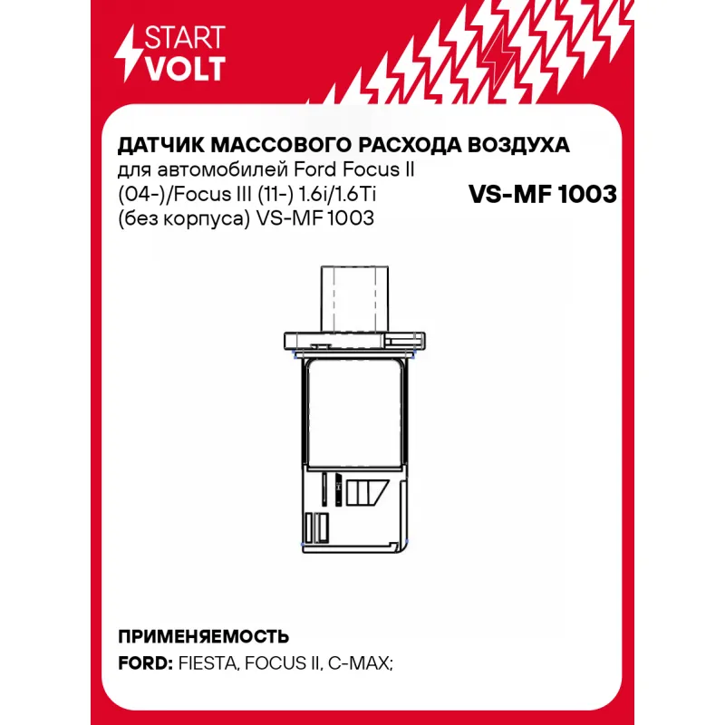Датчик массового расхода воздуха для автомобилей Ford Focus II (04-)/Focus III (11-) 1.6i/1.6Ti (без корпуса) Характеристики: Артикул: VS-MF 1003 OEM номера: 3L3F12B579BA, 3L3Z12B579BA, 3W4Z12B579AC, 4515688, 3L3A12B579BA, 3W4Z12B579AB, L3H513215, 2505081 Количество контактов: 6 Тип корпуса: Без корпуса Количество на автомобиль: 1 Комплектация: Датчик массового расхода воздуха - 1 шт Паспорт изделия/гарантийный талон - 1 шт Гарантия: от 1 года.