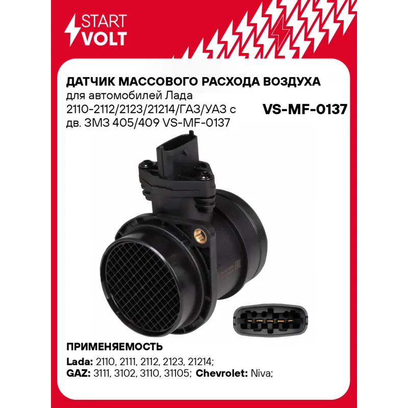 Датчик массового расхода воздуха для автомобилей Лада 2110-2112/2123/21214/ГАЗ/УАЗ с дв. ЗМЗ 405/409 Характеристики: Артикул: VS-MF-0137 OEM номера: 21083-1130010-10, 2111-1411020-70, 2111-1411020-71, 2111-1411020-72, 2111-1411020-80, 2111-1411020-61, 2111-1411020-62, 2104-1411020, 2112-1411020-01, 2112-1411020-71, 2112-1411020-40, 2112-1411020-41, 2112-1411020-42, 2112-1411020-50, 2112-1411020-10, 2123-1411020-10, 21214-1411020-10, 0280218037 Количество контактов: 5 Тип корпуса: С корпусом Впускной диаметр, мм: 70.5 Выпускной диаметр, мм: 69.8 Количество на автомобиль: 1 Подходящий разъем AIRLINE:: AECC017 Подходит для авто: ВАЗ 2110, 2111, 2112, 2123, 21214 ГАЗ 3111, 3102, 3110, 31105 Chevrolet Niva (02-) Для проверки применяемости отправьте VIN автомобиля через вкладку "Есть вопросы о товаре?" Комплектация: Датчик массового расхода воздуха - 1 шт Паспорт изделия/гарантийный талон - 1 шт Гарантия: от 1 года.