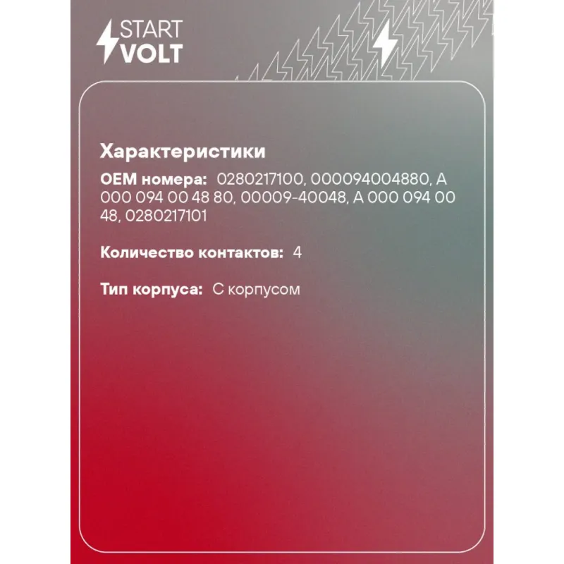 Датчик массового расхода воздуха для автомобилей Mercedes-Benz C (00-) 1.8i/2.0i/E W210 (95-) 2.3i Характеристики: Артикул: VS-MF-1517 OEM номера: 0280217100, 000094004880, A 000 094 00 48 80, 00009-40048, A 000 094 00 48, 0280217101 Количество контактов: 4 Тип корпуса: С корпусом Впускной диаметр, мм: 70.5 Выпускной диаметр, мм: 69.5 Количество на автомобиль: 1 Подходит для авто: Mercedes-Benz E-Class W210 (95-), C-Class W202 (93-), C-Class W203 (00-) Для проверки применяемости отправьте VIN автомобиля через вкладку "Есть вопросы о товаре?" Комплектация: Датчик массового расхода воздуха - 1 шт Паспорт изделия/гарантийный талон - 1 шт Гарантия: от 1 года.