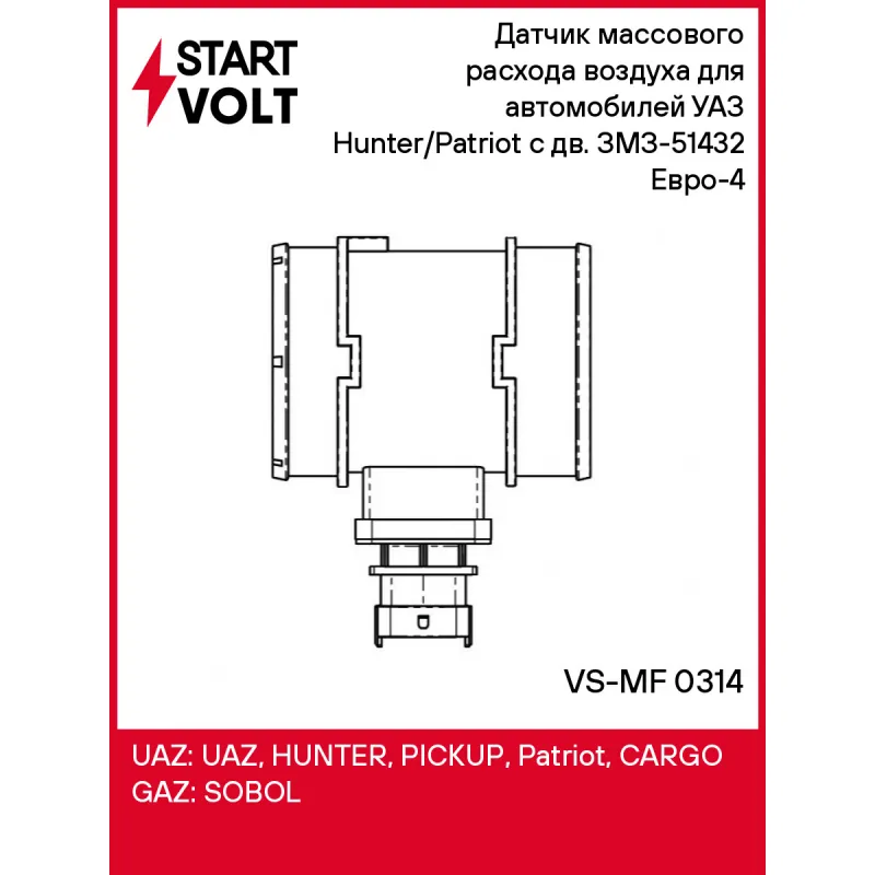 Датчик массового расхода воздуха для автомобилей УАЗ Hunter/Patriot с дв. ЗМЗ-51432 Евро-4 Характеристики: Артикул: VS-MF 0314 OEM номера: 0281006291, 316380387701000 Количество контактов: 4 Тип корпуса: С корпусом Впускной диаметр, мм: 70 Выпускной диаметр, мм: 69,8 Количество на автомобиль: 1 Комплектация: Датчик массового расхода воздуха - 1 шт Паспорт изделия/гарантийный талон - 1 шт Гарантия: от 1 года.