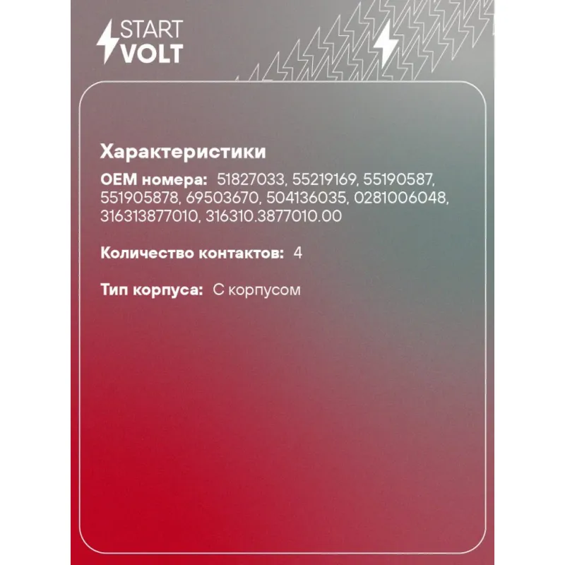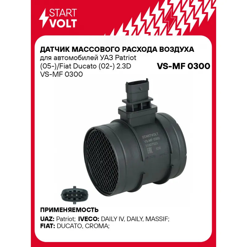 Датчик массового расхода воздуха для автомобилей УАЗ Patriot (05-)/Fiat Ducato (02-) 2.3D Характеристики: Артикул: VS-MF 0300 OEM номера: 51827033, 55219169, 55190587, 551905878, 69503670, 504136035, 0281006048, 316313877010 , 316310.3877010.00 Количество контактов: 4 Тип корпуса: С корпусом Впускной диаметр, мм: 80 Выпускной диаметр, мм: 80 Количество на автомобиль: 1 Комплектация: Датчик массового расхода воздуха - 1 шт Паспорт изделия/гарантийный талон - 1 шт Гарантия: от 1 года.