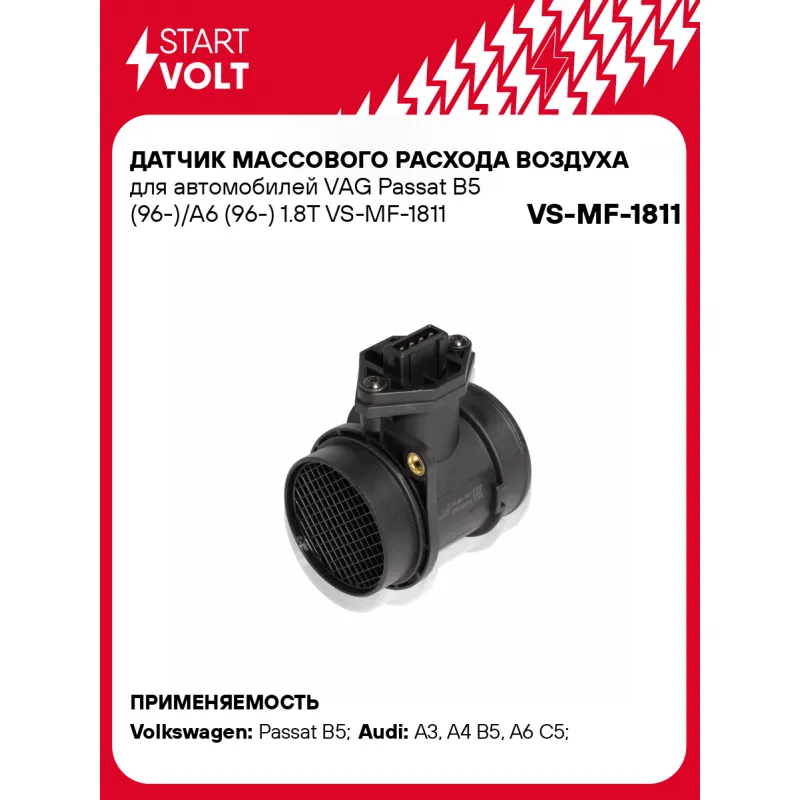 Датчик массового расхода воздуха для автомобилей VAG Passat B5 (96-)/A6 (96-) 1.8T Характеристики: Артикул: VS-MF-1811 OEM номера: 058133471A, 0280217112 Количество контактов: 4 Тип корпуса: С корпусом Впускной диаметр, мм: 70 Выпускной диаметр, мм: 71 Количество на автомобиль: 1 Подходит для авто: Volkswagen Passat B5 (96-) Audi A3 (96-), A4 B5 (94-), A6 C5 (97-) Для проверки применяемости отправьте VIN автомобиля через вкладку "Есть вопросы о товаре?" Комплектация: Датчик массового расхода воздуха - 1 шт Паспорт изделия/гарантийный талон - 1 шт Гарантия: от 1 года.