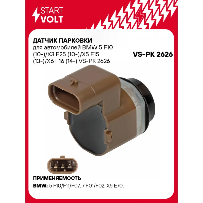 Датчик парковки для автомобилей BMW 5 F10 (10-)/X3 F25 (10-)/X5 F15 (13-)/X6 F16 (14-) Характеристики: Артикул: VS-PK 2626 OEM номера: 66202180495, 66209233031, 66202151635, 66209233038, 2151635, 2180495, 66209233043, 66209233035, 66209233036, 66209233039, 66209233040, 66209233041, 66209233042, 66209233028, 66209233029, 66209233030, 66209233032, 66209233033, 66209233034 Количество контактов: 3 Сторона установки: Спереди/Сзади Форма: Согнутый Подходит для авто: BMW 5 F10/F11/F07 (10-), 5 F10/F11/F07 (10-), 7 F01/F02 (08-), X5 E70 (07-), X5 E70 (07-), X5 E70 (07-), X6 E71 (08-), X6 E71 (08-), X3 F25 (10-), X5 E70 (07-), 6 F12/F13/F06 (11-) Для проверки применяемости отправьте VIN автомобиля через вкладку "Есть вопросы о товаре?" Комплектация: Датчик парковки - 1 шт Паспорт изделия/гарантийный талон - 1 шт Гарантия: от 1 года.