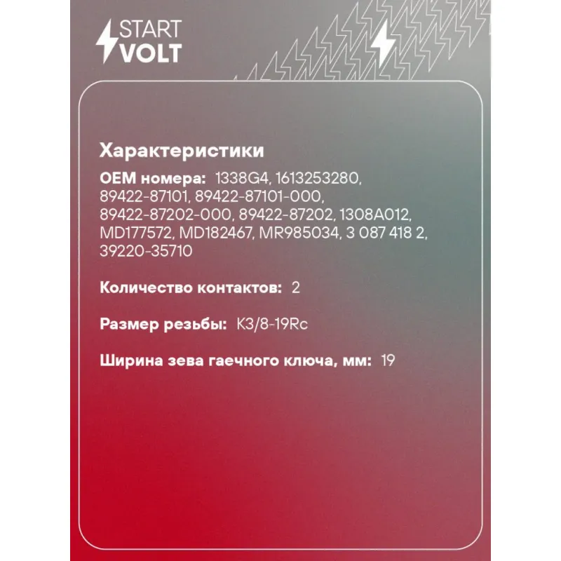 Датчик температуры для автомобилей Mitsubishi Outlander (12-) 2.0i/Lancer IX (03-) 1.6i Характеристики: Артикул: LS 1109 OEM номера: 1338G4, 1613253280, 89422-87101, 89422-87101-000, 89422-87202-000, 89422-87202, 1308A012, MD177572, MD182467, MR985034, 3 087 418 2, 39220-35710, SMD177572 Номинальное напряжение, В: 12 Количество контактов: 2 Размер резьбы: K3/8-19Rc Ширина зева гаечного ключа, мм: 19 Количество на автомобиль: 1 Комплектация: Датчик температуры - 1 шт Гарантия: от 1 года.