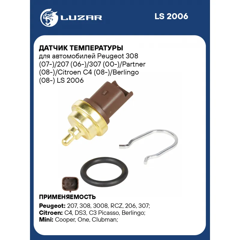 Датчик температуры для автомобилей Peugeot 308 (07-)/207 (06-)/307 (00-)/Partner (08-)/Citroen C4 (08-)/Berlingo (08-) Характеристики: Артикул: LS 2006 OEM номера: 13627535068, 1338F8, 96566364, V7535068, 1338F3 Трансмиссия: MT/AT Кондиционер: + Размер резьбы: - Количество на автомобиль: 1 Комплектация: уплотнительное кольцо, крепежная скоба Сопротивление при температуре 20°С, Ом: 6245 Сопротивление при температуре 60°С, Ом: 1244 Сопротивление при температуре 90°С, Ом: 459 Сопутствующие товары:: LT 20Z6; LT 20Z8; LT 2006; LT 2008; LT 2018; LT 2017; LT 20S5; LT 2005; LT 2026; LT 2048 Подходит для авто: Peugeot 207 (06-), 308 (07-), 3008 (09-), RCZ (10-), 206 (00-), 307 (00-), 1007 (05-), 408 (10-), 301 (12-), 308 (07-), Partner (08-) Citroen C4 (10-), DS3 (10-), C3 Picasso (09-), Berlingo (00-), Berlingo II (08-), C4 (04-), C-Elysee (12-), C2 (03-), C3 (02-) Mini Cooper (06-), One (09-), Clubman (07-) Для проверки применяемости отправьте VIN автомобиля через вкладку "Есть вопросы о товаре?" Комплектация: Датчик температуры - 1 шт Уплотнительное кольцо - 1 шт Крепежная скоба - 1 шт Гарантия: от 1 года.