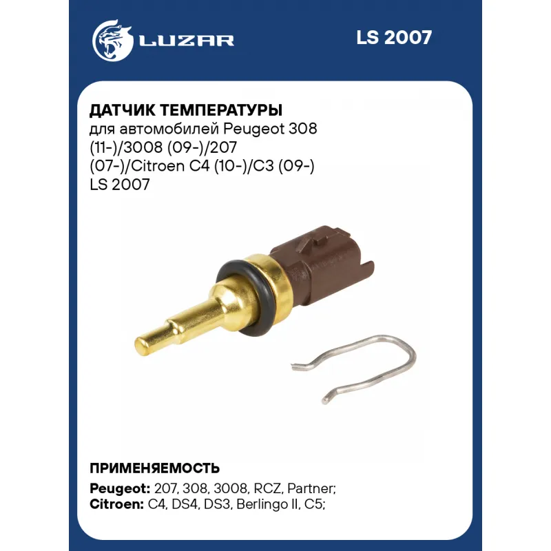 Датчик температуры для автомобилей Peugeot 308 (11-)/3008 (09-)/207 (07-)/Citroen C4 (10-)/C3 (09-) Характеристики: Артикул: LS 2007 OEM номера: 9810048680 Трансмиссия: MT/AT Кондиционер: + Сопутствующий товар: Термостаты: LT 2070; LT 2080; LT 2027; LT 2038; LT 2047 Количество на автомобиль: 1 Сопротивление при температуре 20°С, Ом: 6264,8 Сопротивление при температуре 60°С, Ом: 1243,5 Сопротивление при температуре 90°С, Ом: 458 Комплектация: уплотнительное кольцо, крепежная скоба Подходит для авто: Peugeot 207 (06-), 308 (07-), 3008 (09-), RCZ (10-), Partner (08-) Citroen C4 (10-), DS4 (11-), DS3 (10-), Berlingo II (08-), C5 (08-), C3 Picasso (09-), DS5 (12-) Для проверки применяемости отправьте VIN автомобиля через вкладку "Есть вопросы о товаре?" Комплектация: Датчик температуры - 1 шт Уплотнительное кольцо - 1 шт Крепежная скоба - 1 шт Гарантия: от 1 года.