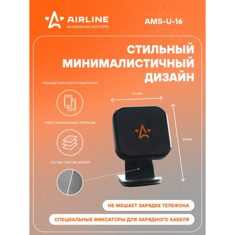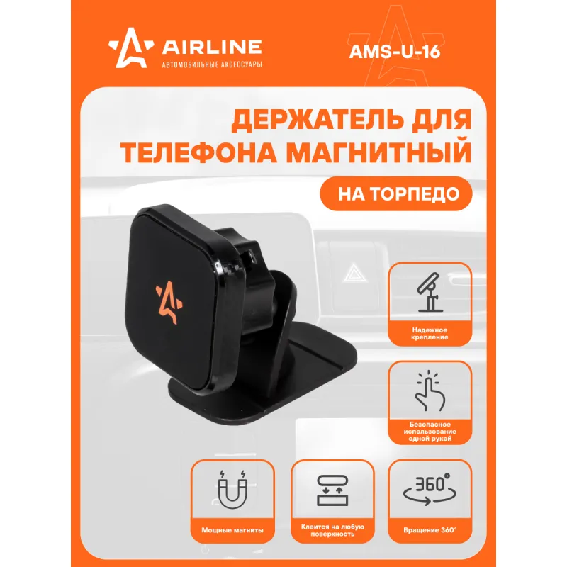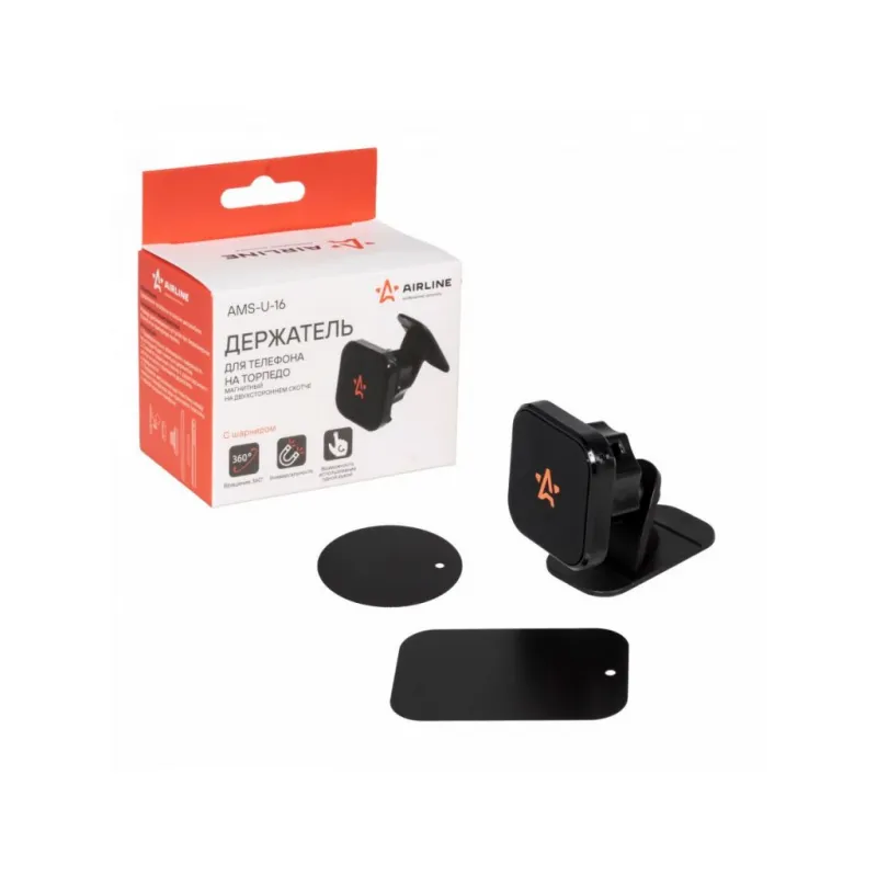 Держатель для телефона автомобильный на торпедо магнитный на двухстороннем скотче Описание: Универсальный держатель для телефона на металлической штанге AMS-U-16 бренда AIRLINE поможет вам всегда держать гаджет под рукой и безопасно использовать его в дороге. Универсальный дизайн и классический черный цвет позволят использовать интересный аксессуар в любом автомобиле как легковом, так и грузовом. Гарантия 6 месяцев. Автомобильный крепеж для смартфона легко крепится на лобовое стекло при помощи присоски. Крепеж липучка обеспечивает надежную фиксацию на любой поверхности. Держатель крепится на поверхность торпедо на двухсторонний скотч. В комплекте идут две металлические пластины, круглая и прямоугольная, одну из которых необходимо прикрепить к задней крышке телефона. Держатель имеет шарнир для изменения угла наклона телефона. Мощные магниты и резиновая накладка надёжно фиксируют телефон. Держатель изготовлен из металла, а также из прочного и долговечного пластикового материала. Он крепкий, износостойкий, так что аксессуар прослужит вам долго. Держатель это популярный мужской или женский подарочный набор для автомобилиста. Сделайте сюрприз парню, девушке, маме, папе, брату, сестре или другому близкому человеку на день рождения, новый год, 23 февраля и другой праздник. Товар официального производителя AIRLINE. Характеристики: Артикул: AMS-U-16 Тип держателя: Магнитный Особенности крепления: Клеится на любую поверхность Комплектация: Держатель - 1 шт Металлическая пластина - 2 шт Гарантия: от 1 года.