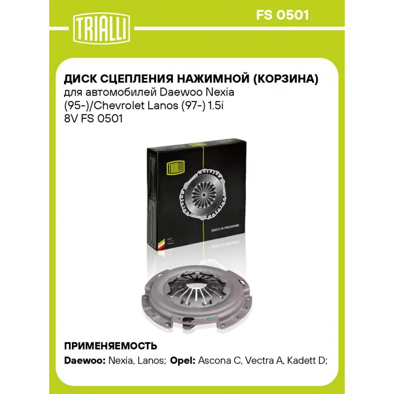 Диск сцепления нажимной (корзина) для автомобилей Daewoo Nexia (95-)/Chevrolet Lanos (97-) 1.5i 8V Характеристики: Артикул: FS 0501 OEM номера: 96162008, 96183980, 96343035, 96285360, 666 003, 666 065, 666 070, 666 101, 666 113, 90006552, 90006554, 90125393, 90125395, 90157255, 90157447, 90251355, 90251376, 90251381, 90251386, 90272320, 90273922 Диаметр, мм: 206 Количество на автомобиль: 1 Сопутствующие товары:: FR 0501, FD 0501 Гарантийный срок: 2 года/60 000 км Диаметр диска, мм: 204 Сопутствующий товар: Комплекты сцепления: FR 0501 Сопутствующий товар: Ведомые диски сцепления: FD 0501 Товарная линейка: BLACK Подходит для авто: Daewoo Nexia (94-), Lanos (97-) Opel Ascona C (81-), Vectra A (88-), Ascona C (81-), Kadett D (79-), Kadett E (84-), Record E (82-) Для проверки применяемости отправьте VIN автомобиля через вкладку "Есть вопросы о товаре?" Комплектация: Диск сцепления нажимной - 1 шт Гарантия: от 1 года.