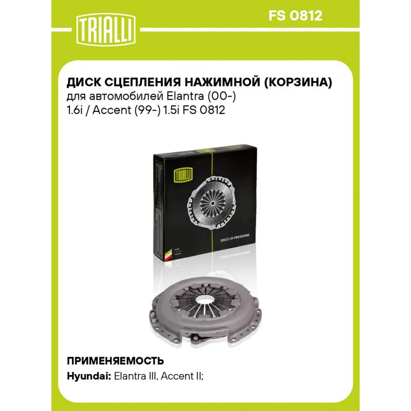 Диск сцепления нажимной (корзина) для автомобилей Elantra (00-) 1.6i / Accent (99-) 1.5i Характеристики: Артикул: FS 0812 OEM номера: 41300-28011, 41300-28050 Диаметр, мм: 215 Количество на автомобиль: 1 Сопутствующие товары:: FR 0812, FD 0812 Гарантийный срок: 2 года/60 000 км Сопутствующий товар: Комплекты сцепления: FR 0812 Сопутствующий товар: Ведомые диски сцепления: FD 0812 Сопутствующий товар: Цилиндры сцепления: CF 8004; CF 9003 Товарная линейка: BLACK Подходит для авто: Hyundai Elantra III (00-), Accent II (99-), Coupe II (01-), Getz (02-) Для проверки применяемости отправьте VIN автомобиля через вкладку "Есть вопросы о товаре?" Комплектация: Диск сцепления нажимной - 1 шт Гарантия: от 1 года.