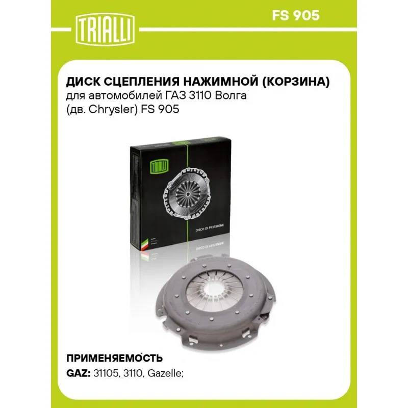 Диск сцепления нажимной (корзина) для автомобилей ГАЗ 3110 Волга (дв. Chrysler) Характеристики: Артикул: FS 905 OEM номера: 31105-1601090, 2217-1601090 Диаметр, мм: 242 Гарантийный срок: 2 года/60 000 км Количество на автомобиль: 1 Сопутствующие товары:: FD 305, FR 796 Особенности конструкции:: двухмассовый маховик Сопутствующий товар: Комплекты сцепления: FR 796 Сопутствующий товар: Ведомые диски сцепления: FD 305 Товарная линейка: BLACK Подходит для авто: ГАЗ 31105, 3110, Gazelle, Gazelle-Business, 2217, 2705 Для проверки применяемости отправьте VIN автомобиля через вкладку "Есть вопросы о товаре?" Комплектация: Диск сцепления нажимной - 1 шт Гарантия: от 1 года.