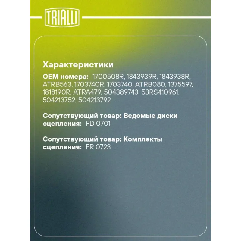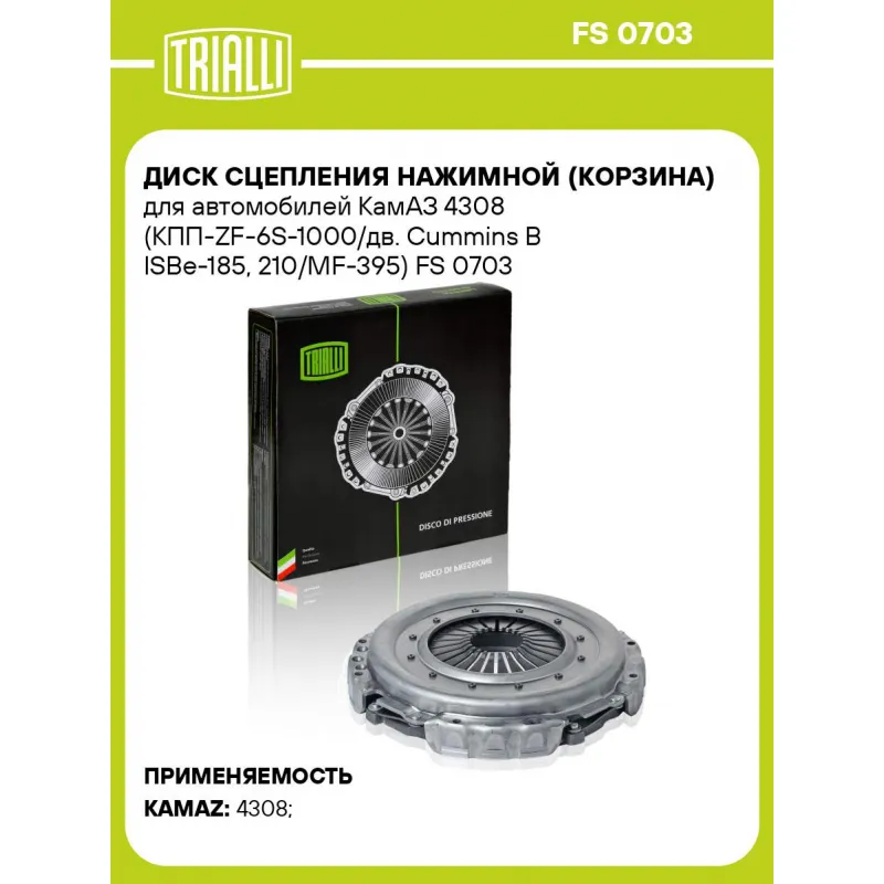 Диск сцепления нажимной (корзина) для автомобилей КамАЗ 4308 (КПП-ZF-6S-1000/дв. Cummins B ISBe-185, 210/MF-395) Характеристики: Артикул: FS 0703 OEM номера: 1700508R, 1843939R, 1843938R, ATRB563, 1703740R, 1703740, ATRB080, 1375597, 1818190R, ATRA479, 504389743, 53RS410961, 504213752, 504213792, 0410 100 010, 3 482 000 474, 183482000474 Диаметр, мм: 396 Тип двигателя: Cummins B ISBe-185 Количество на автомобиль: 1 Гарантийный срок: 12 месяцев без ограничения по пробегу Товарная линейка: BLACK Тип КПП: ZF-6S-1000 Подходит для авто: КамаАЗ 4308, 4308, 4308 Для проверки применяемости отправьте VIN автомобиля через вкладку "Есть вопросы о товаре?" Комплектация: Диск сцепления нажимной - 1 шт Гарантия: от 1 года.