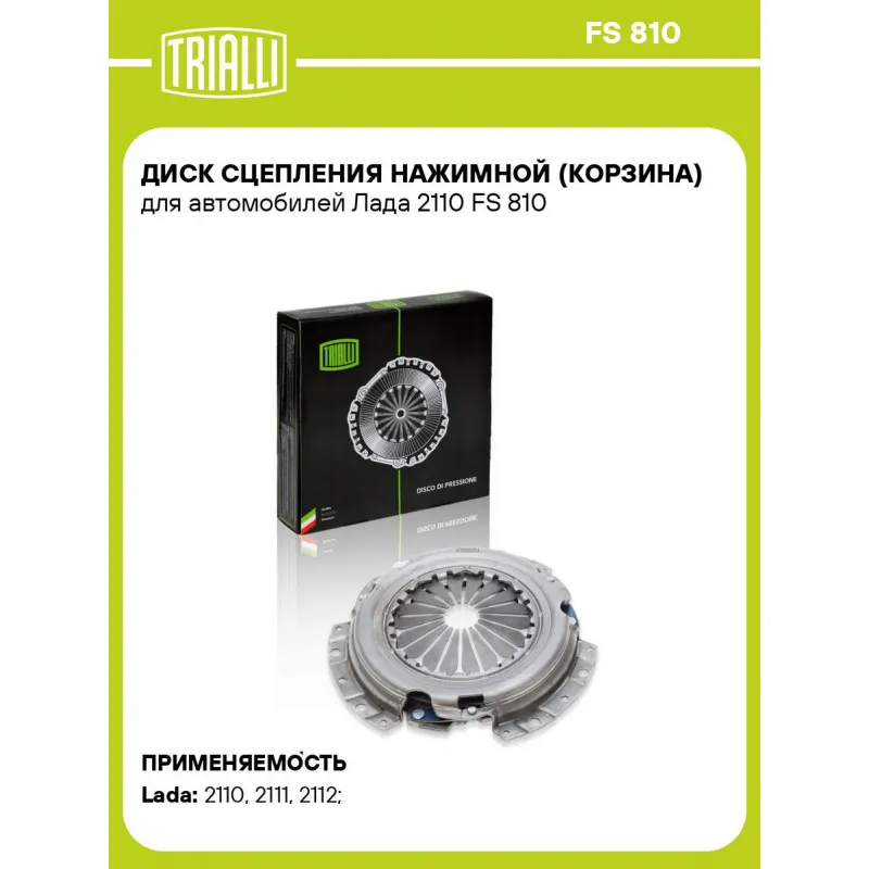 Диск сцепления нажимной (корзина) для автомобилей Лада 2110 Характеристики: Артикул: FS 810 OEM номера: 2110-1601085, 21120160108500, 2112-1601085 Сопутствующие товары:: FD 310, FR 751 Гарантийный срок: 2 года/60 000 км Количество на автомобиль: 1 Диаметр, мм: 200 Сопутствующий товар: Комплекты сцепления: FR 718 Товарная линейка: BLACK Подходит для авто: ВАЗ 2110, 2110, 2111, 2111, 2112, 2112, 2110, 2111, 2112 Для проверки применяемости отправьте VIN автомобиля через вкладку "Есть вопросы о товаре?" Комплектация: Диск сцепления нажимной - 1 шт Гарантия: от 1 года.