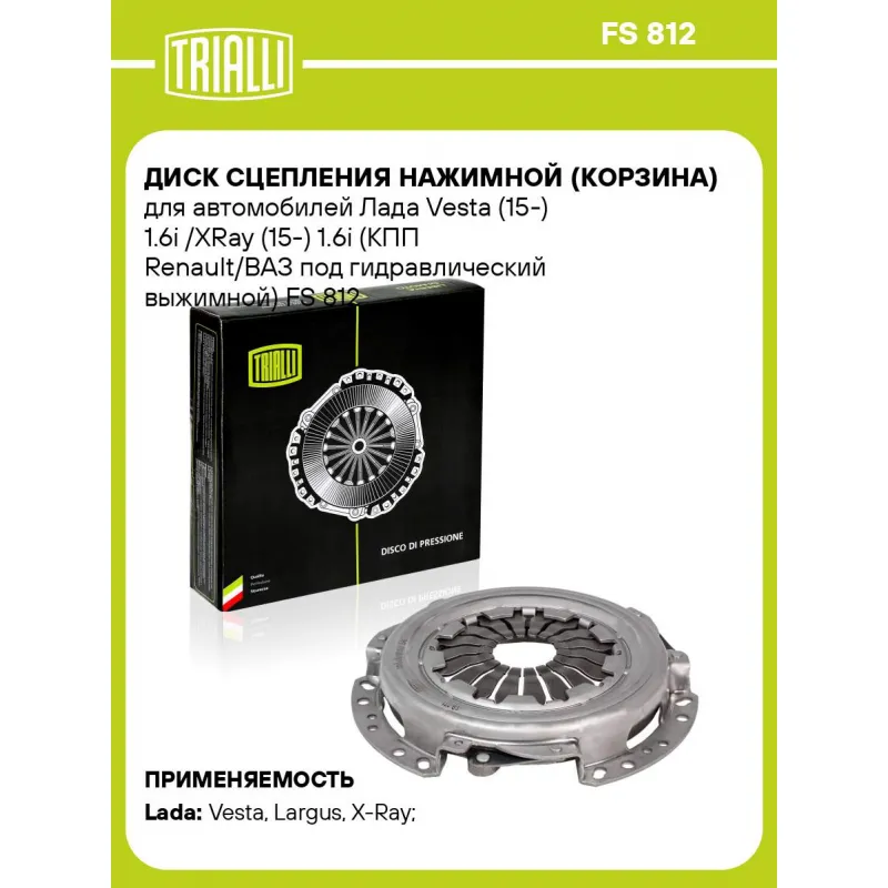 Диск сцепления нажимной (корзина) для автомобилей Лада Vesta (15-) 1.6i /XRay (15-) 1.6i (КПП Renault/ВАЗ под гидравлический выжимной) Характеристики: Артикул: FS 812 OEM номера: 11189-1601085-00, 11189-1601085 Сопутствующие товары:: FR 771, FD 312 Особенности конструкции:: под гидравлический выжимной Гарантийный срок: 2 года/60 000 км Количество на автомобиль: 1 Диаметр, мм: 201,5 Тип двигателя: 11189 (P3M), 21129 (P4M) Сопутствующий товар: Комплекты сцепления: FR 771 Товарная линейка: BLACK Тип КПП: JH3, JR5, ВАЗ 21809 Подходит для авто: ВАЗ Vesta (15-), Largus (12-), X-Ray (15-) Для проверки применяемости отправьте VIN автомобиля через вкладку "Есть вопросы о товаре?" Комплектация: Диск сцепления нажимной - 1 шт Гарантия: от 1 года.