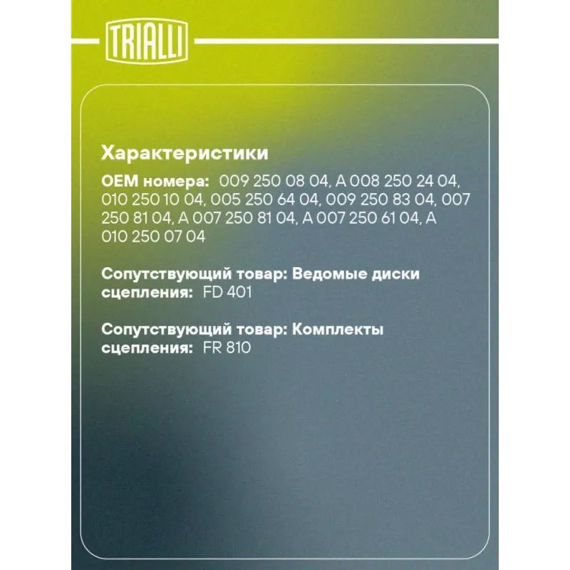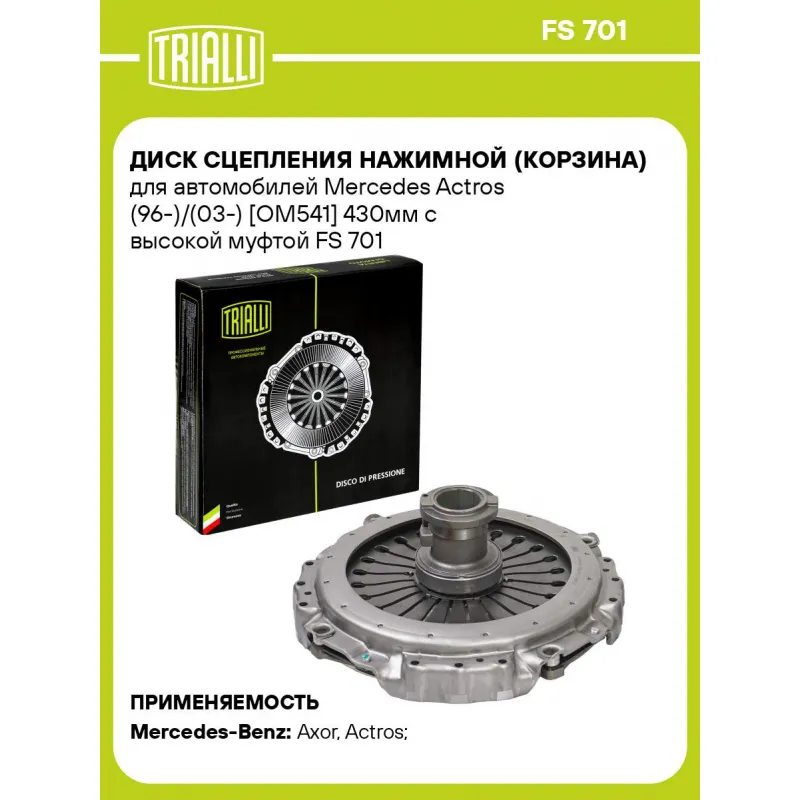 Диск сцепления нажимной (корзина) для автомобилей Mercedes Actros (96-)/(03-) [OM541] 430мм с высокой муфтой Характеристики: Артикул: FS 701 OEM номера: 009 250 08 04, A 008 250 24 04, 010 250 10 04, 005 250 64 04, 009 250 83 04, 007 250 81 04, A 007 250 81 04, A 007 250 61 04, A 010 250 07 04, 007 250 61 04, A 009 250 08 04, 010 250 07 04, 005 250 66 04, A 010 250 10 04, 008 250 30 04, A 008 250 30 04, A 009 250 83 04, A 005 250 66 04, A 005 250 64 04, 008 250 24 04, 102500704, 102501004, 52506404, 52506604, 72506104, 72508104, 82502404, 82503004, 92500804, 92508304 Сопутствующие товары:: FR 810, FD 401 Особенности конструкции:: предварительная сборка Гарантийный срок: 12 месяцев без ограничения по пробегу Количество на автомобиль: 1 Диаметр, мм: 430 Выталкивающая сила: 35 000 N Товарная линейка: BLACK Подходит для авто: Mercedes-Benz Axor (01-), Axor (04-), Actros (96-), Actros (03-), Axor (01-), Axor (04-) Для проверки применяемости отправьте VIN автомобиля через вкладку "Есть вопросы о товаре?" Комплектация: Диск сцепления нажимной c установленной муфтой - 1 шт Гарантия: от 1 года.