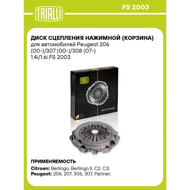 Диск сцепления нажимной (корзина) для автомобилей Peugeot 206 (00-)/307 (00-)/308 (07-) 1.4i/1.6i Характеристики: Артикул: FS 2003 OEM номера: 2004.Y2, 2004.AK, 2004.EL, 96 867 529 80 Диаметр, мм: 200,5 Количество на автомобиль: 1 Сопутствующие товары:: FD 2003, FR 2002, FR 2005 Гарантийный срок: 2 года/60 000 км Сопутствующий товар: Комплекты сцепления: FR 2003,FR 2005, FR 2002 Сопутствующий товар: Ведомые диски сцепления: FD 2003 Товарная линейка: BLACK Подходит для авто: Citroen Berlingo (00-), Berlingo II (08-), C2 (03-), C3 (02-), C4 (04-), Saxo (96-), Xsara II (00-) Peugeot 206 (00-), 207 (06-), 306 (97-), 307 (00-), Partner (96-), 1007 (05-), 106 (96-), Partner (08-) Для проверки применяемости отправьте VIN автомобиля через вкладку "Есть вопросы о товаре?" Комплектация: Диск сцепления нажимной - 1 шт Гарантия: от 1 года.
