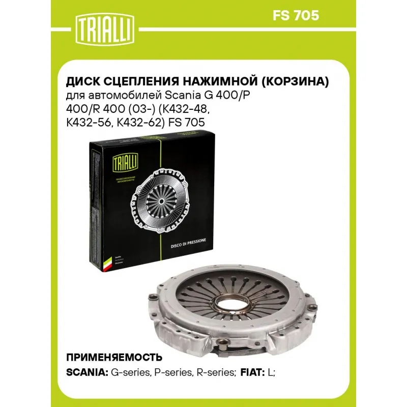 Диск сцепления нажимной (корзина) для автомобилей Scania G 400/P 400/R 400 (03-) (K432-48, K432-56, K432-62) Характеристики: Артикул: FS 705 OEM номера: 574872, 1854205, 1763155, 2302254, 1914989, 2023015, 2675343, 2568869, 574950, 1547163, 2668020, 574867, 2163969, 574852, 2619739, 1479574, 2568925, 2455882, 574864, 574859, 574865 Сопутствующие товары:: CT 121, FR 817, FD 404 Особенности конструкции:: Для производителя: Scania K432-48, Scania K432-56, Scania K432-62 Гарантийный срок: 12 месяцев без ограничения по пробегу Количество на автомобиль: 1 Диаметр, мм: 471 Тип двигателя: DC 09.109, DC 09.111, DC 09.113, DC 9.12, DC 9.13, DC 9.16, DC 9.17, DC 9.29, DC 9.36, DC 9.38, DC 11.08, DC 11.09, DC 12.10, DC 12.13, DC 12.18, DC 13.05, DC 13.113, DC 13.149, DC 13.162, OSC 11.03, Сопутствующий товар: Комплекты сцепления: FR 817 Сопутствующий товар: Ведомые диски сцепления: FD 404 Сопутствующий товар: Муфты сцепления: CT 121 Товарная линейка: BLACK Комплектация: Диск сцепления нажимной - 1 шт Гарантия: от 1 года.
