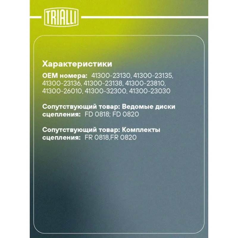 | Сопутствующий товар: Ведомые диски сцепления | FD 0818; FD 0820 |