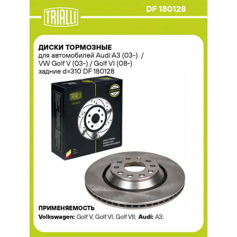 Диски тормозные для автомобилей Audi A3 (03-) / VW Golf V (03-) / Golf VI (08-) задние d=310 Характеристики: Артикул: DF 180128 OEM номера: 1K0615601N, 5Q0615601E, 5QM615601A, JZW698601AQ Количество на автомобиль: 2 Сторона установки: Задняя ось Тип диска: Вентилируемый Гарантийный срок: 2 года / 60 000 км Диаметр внешний: 310 Диаметр центрирования: 65 Высота: 48.5 Толщина диска: 22 Мин. толщина диска: 20 Количество креп. отверстий: 5 Диаметр располож. креп. отверстий: 112 Разболтовка (PCD): 5*112 Сопутствующий товар: Колодки тормозные дисковые: PF 1879 Сопутствующий товар: Суппорты тормозные: CF 182001; CF 182002; CF 182003; CF 182004; CF 182065; CF 182066; CF 182067; CF 182068; CF 182551; CF 182552; CF 182555; CF 182556 Товарная линейка: BLACK Количество в коробке, шт.: 2 Сопутствующий товар: Диски тормозные: DF 180106; DF 180107; DF 180108; DF 180112; DF 180114; DF 180121; DF 180129; DF 180130 Подходит для авто: Volkswagen Golf V (03-), Golf VI (08-), Golf VII (12-), Golf V (03-), Golf VI (08-), Golf VII (12-) Audi A3 (03-), A3 (03-) Для проверки применяемости отправьте VIN автомобиля через вкладку "Есть вопросы о товаре?" Комплектация: Диск тормозной - 1 шт Гарантия: от 1 года.